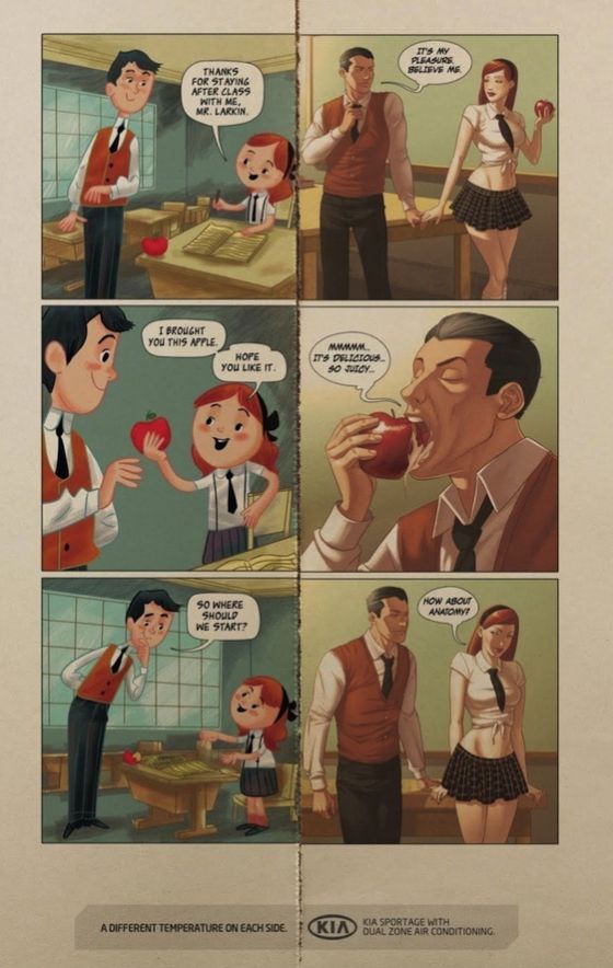 Como el coche tiene dos zonas de climatización, en un lado las ilustraciones son frías e inocentes y en el otro calientes y sexualizadas. El anuncio ganó un León de plata en el Festival. Ante la controversia generada, la agencia tuvo que declarar que no había sido aprobada por KIA. El Festival descalificó la campaña y le quitó el premio que había sido otorgado.
