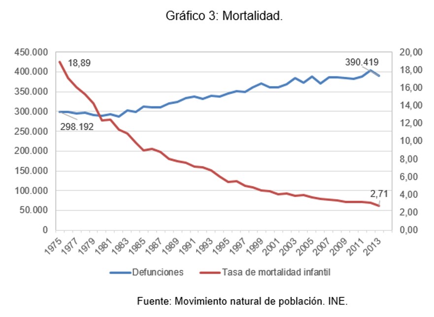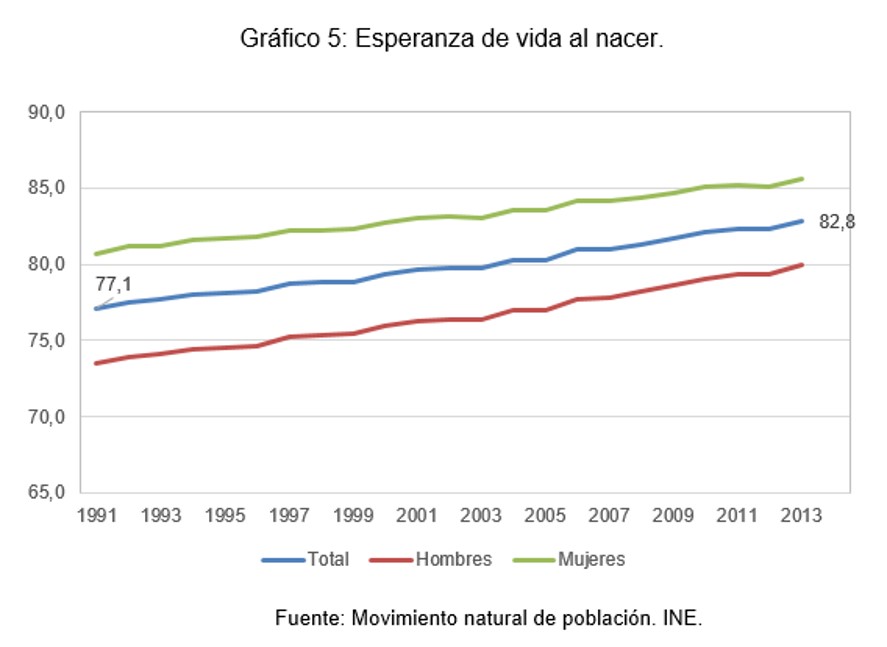 Porque como muestran los siguientes gráficos el total de la población española inicia un lento declive. Lento porque a pesar de que tenemos pocos hijos y de que muchos extranjeros con la crisis han retornado a su país (colectivo joven en edad reproductiva). Vivimos cada vez más años, con una esperanza de vida de casi 83 años.