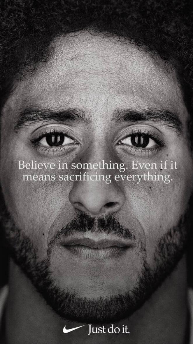 Poco después la marca lanzaba una nueva línea de comunicación con el claim «Believe in something. Even if it means sacrificing nothing” con un protagonista controvertido: Colin Kaepernick. Un jugador profesional de fútbol americano estadounidense que juega en la posición de quarterbacky que a finales de 2016 se hizo célebre por haberse arrodillado durante la interpretación del Himno estadounidense en un partido oficial de la liga. Poco antes, había comenzado a desarrollar el «Campamento: Conoce tus Derechos» (KYRC) una campaña dirigida a jóvenes interesada en aumentar la conciencia sobre la educación superior, la alfabetización financiera, cómo interactuar con la aplicación de la ley, entre otros.