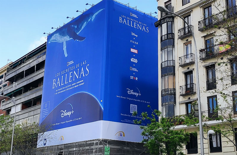 Con motivo del estreno del documental de National Geographic «Los secretos de las ballenas», Disney+ ha instalado en Madrid una lona sostenible.