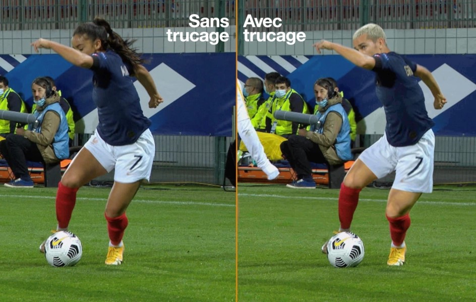Utilizando la tecnología se mostraban una recopilación de acciones del equipo masculino de Francia. Jugadas que aparecen en las botas de las grandes estrellas masculinas de Francia, pero que pocos instantes después se revela que en realidad son de las jugadoras de Francia.