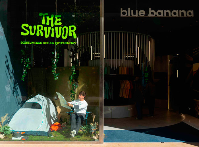 El pasado sábado 19 de octubre la firma de moda y aventura Blue Banana sorprendió a los viandantes de La Rambla de Catalunya con “The Survivor”, su último reto a cargo del creador de contenido Pepe Jiménez. El objetivo, consistía en permanecer dentro del escaparate diez horas, buscando la manera de conseguir todo lo necesario para sobrevivir con las prendas de Blue Banana como moneda de cambio. Y con solo una pizarra y sus redes sociales como forma de comunicación.