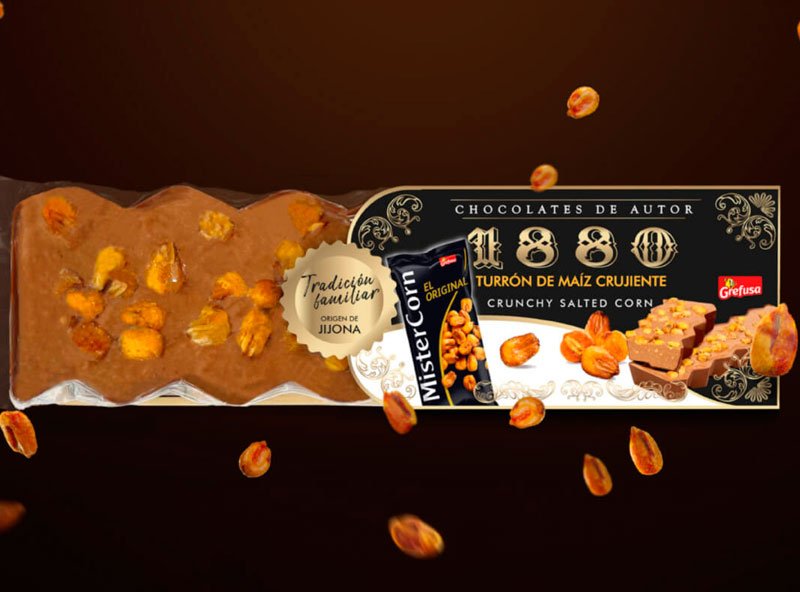 Continúan las colaboraciones en el el mercado de turrones, MisterCorn de Grefusa y 1880, lanzan al mercado su creación navideña estrella que combina el turrón artesano de calidad 1880 y el toque crujiente del maíz frito de MisterCorn.