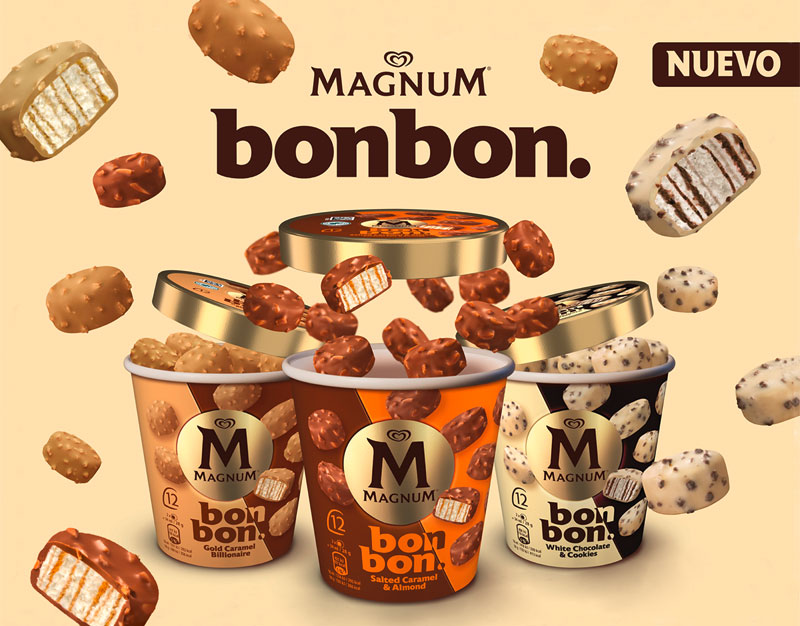 Magnum presenta bonbon, su primera apuesta en formato snack para disfrutar de un bocado. Y lo lanza con tres sabores que combinan helado cremoso, salsa envolvente y chocolate crujiente elaborado con granos de cacao cuidadosamente seleccionados y certificados por Rainforest Alliance: White Chocolate & Cookies, Gold Caramel Billionaire y Salted Caramel & Almond.