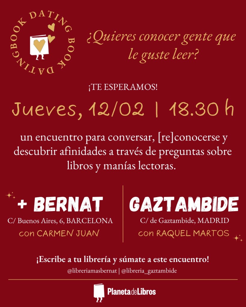 Se acerca San Valentín la fecha para celebrar el amor y porque no la cultura. PlanetadeLibros ha lanzado el Book Dating en Madrid y Barcelona. Los participantes mantendrán conversaciones exprés de tres minutos, guiadas por un kit de preguntas literarias pensadas para romper el hielo: libros que les marcaron, personajes inolvidables o manías lectoras.